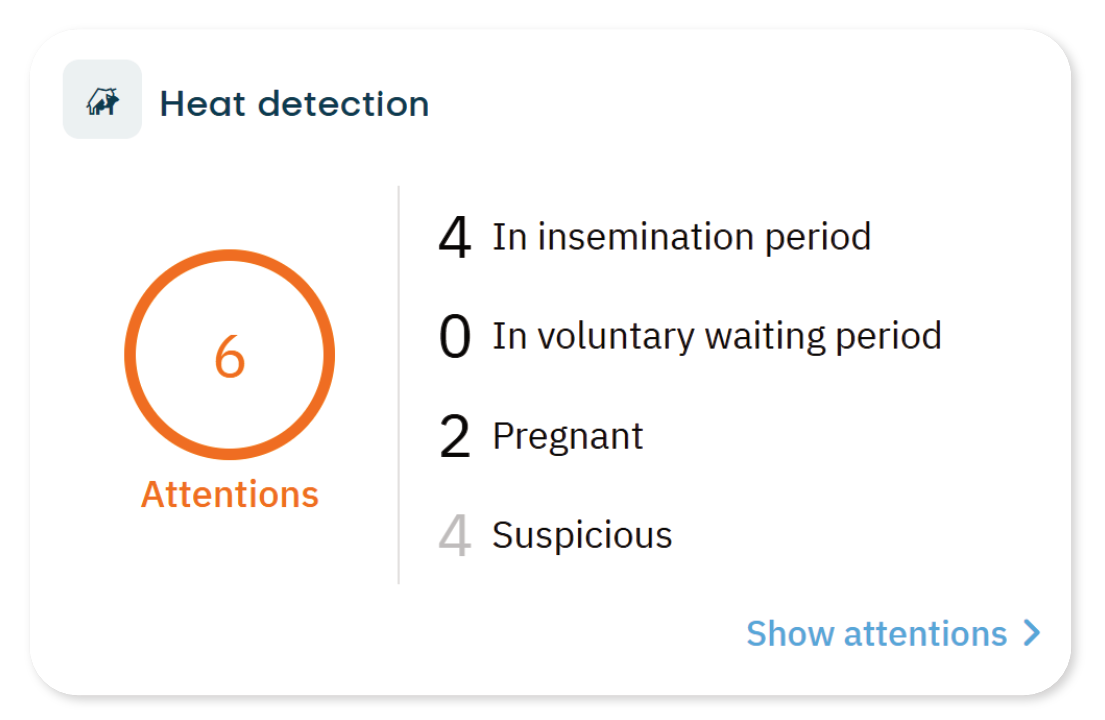 The Heat detection feature helps you monitor animals that show signs of heat, by identifying the optimal insemination moment, heat scores, and historical heat patterns. With this information, you can determine which animals are ready for insemination and which may require additional attention. The Heat detection tile on the dashboard gives a clear overview of current heat attentions, indicating if you need to take action.