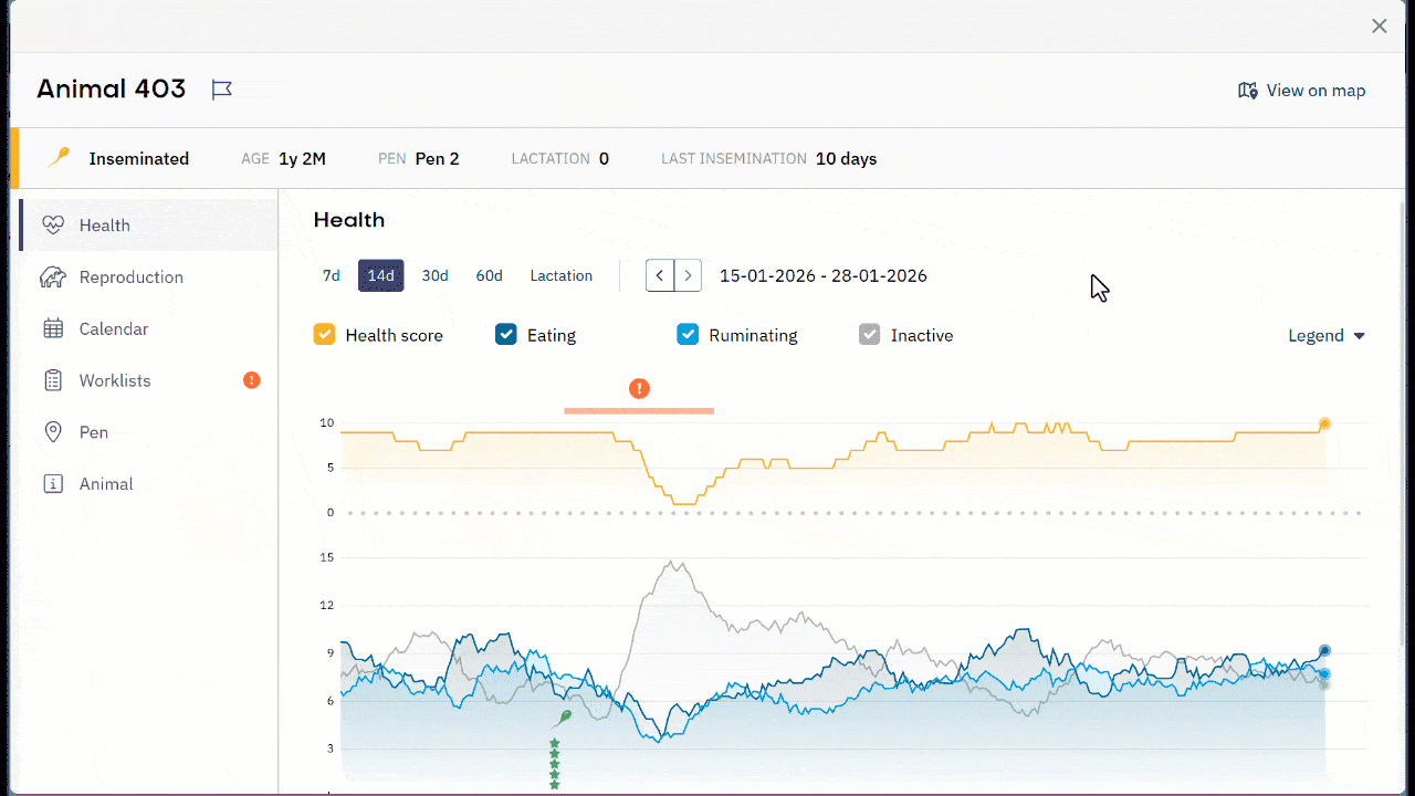 1. Select what to show: Use the checkboxes to show or hide health scores or behavioral types (eating, ruminating, inactive).