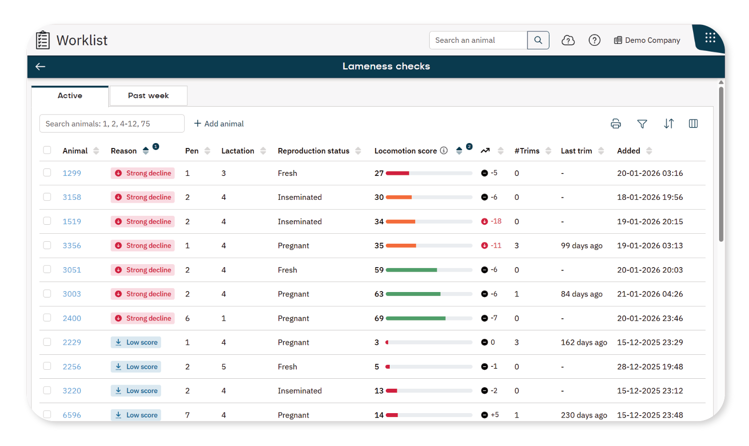 - Active: Shows animals currently detected with a locomotion issue.