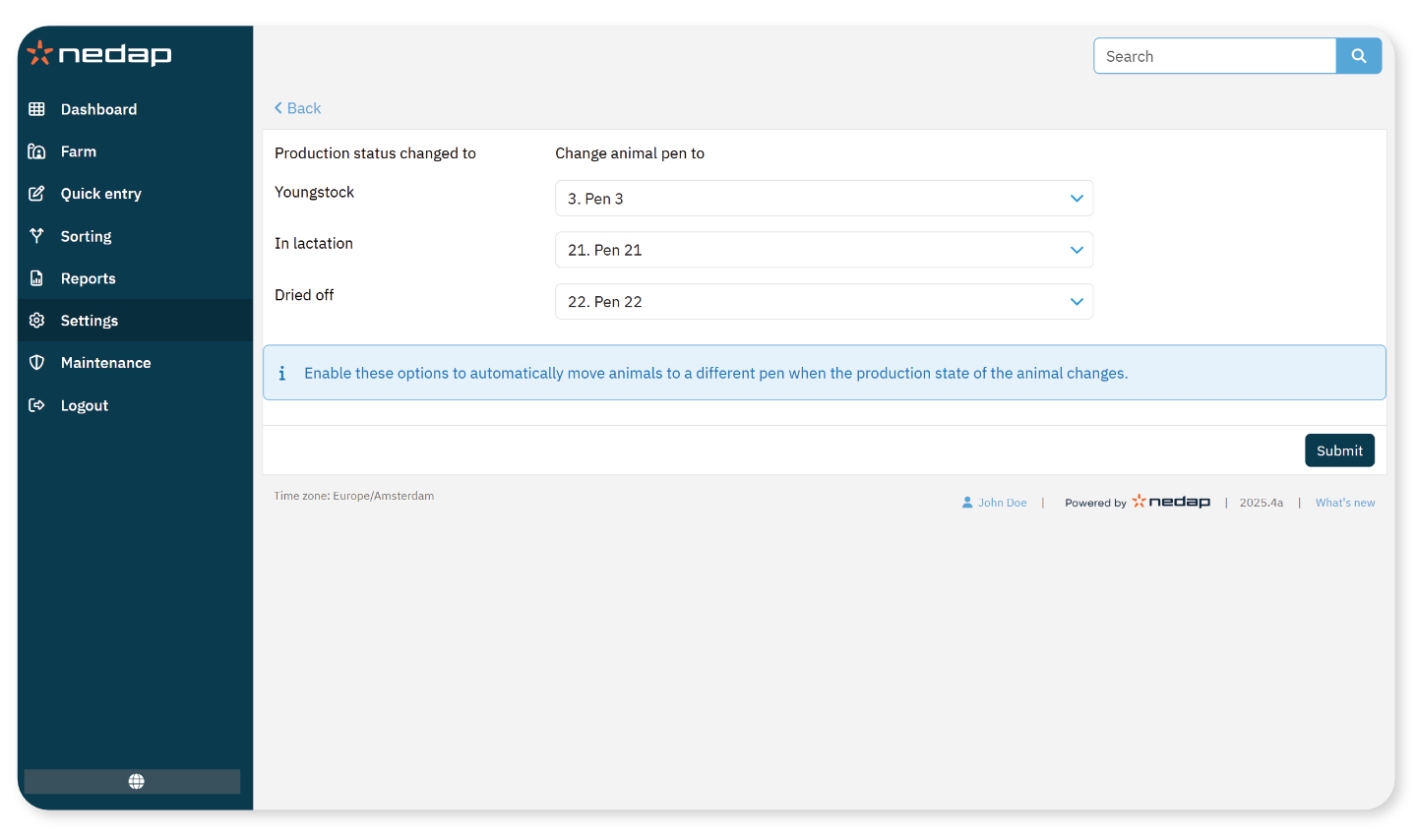Use this feature if you want animals to move automatically when their production stage changes, for example after calving or during the dry period. This helps you organize pens without moving animals manually.