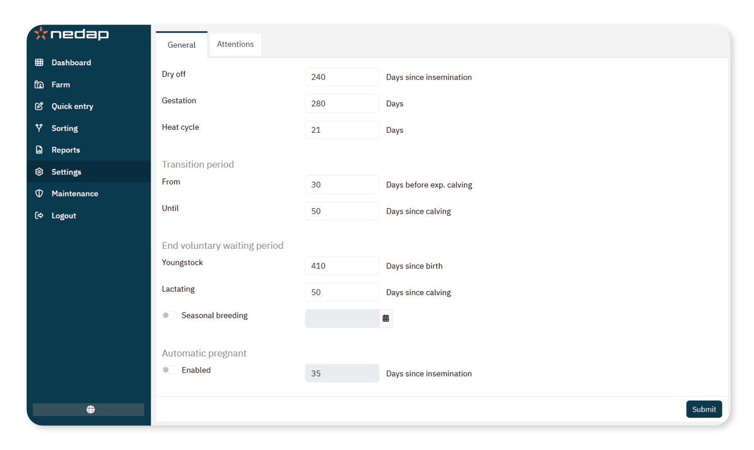The general settings specify the number of days that determine the normal timing of events (for example, the expected gestation or dry-off period). You can alter these settings to fit your farm management.