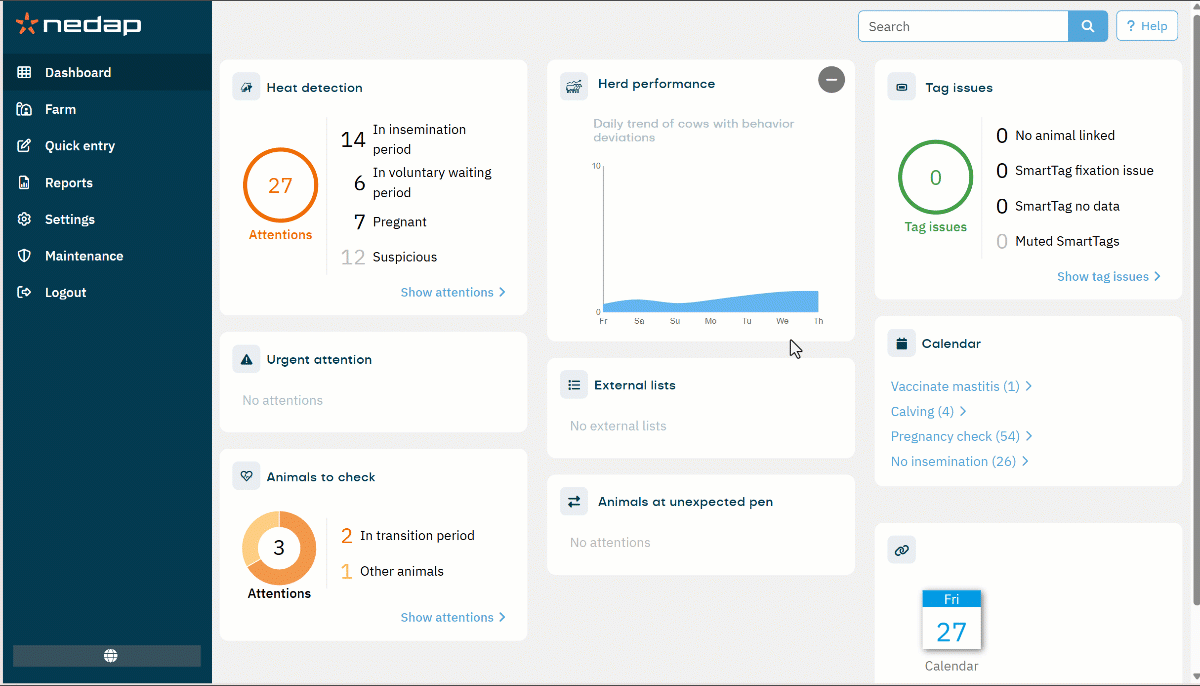 Velos offers a set of Calendar reports that provide essential insights into all time-based activities within the herd. The Calendar events report shows all recorded events, such as calving, insemination, or dry-off actions.