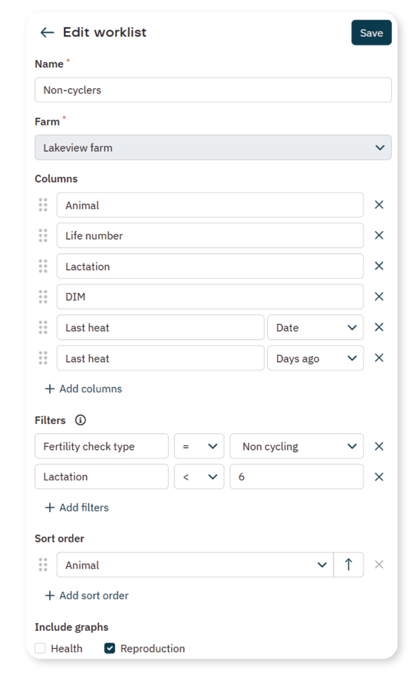 • An additional filter for DIM (>) a defined value could be added if you want the list to only include cows over a certain amount of DIM/days since calved.