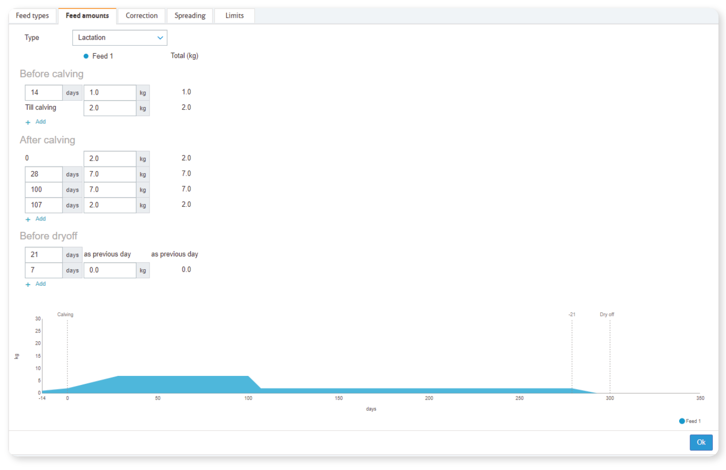Als melken in je licentie is inbegrepen, kun je de voerhoeveelheden ook aanpassen op basis van de melkgift met behulp van een melk-voertabel.