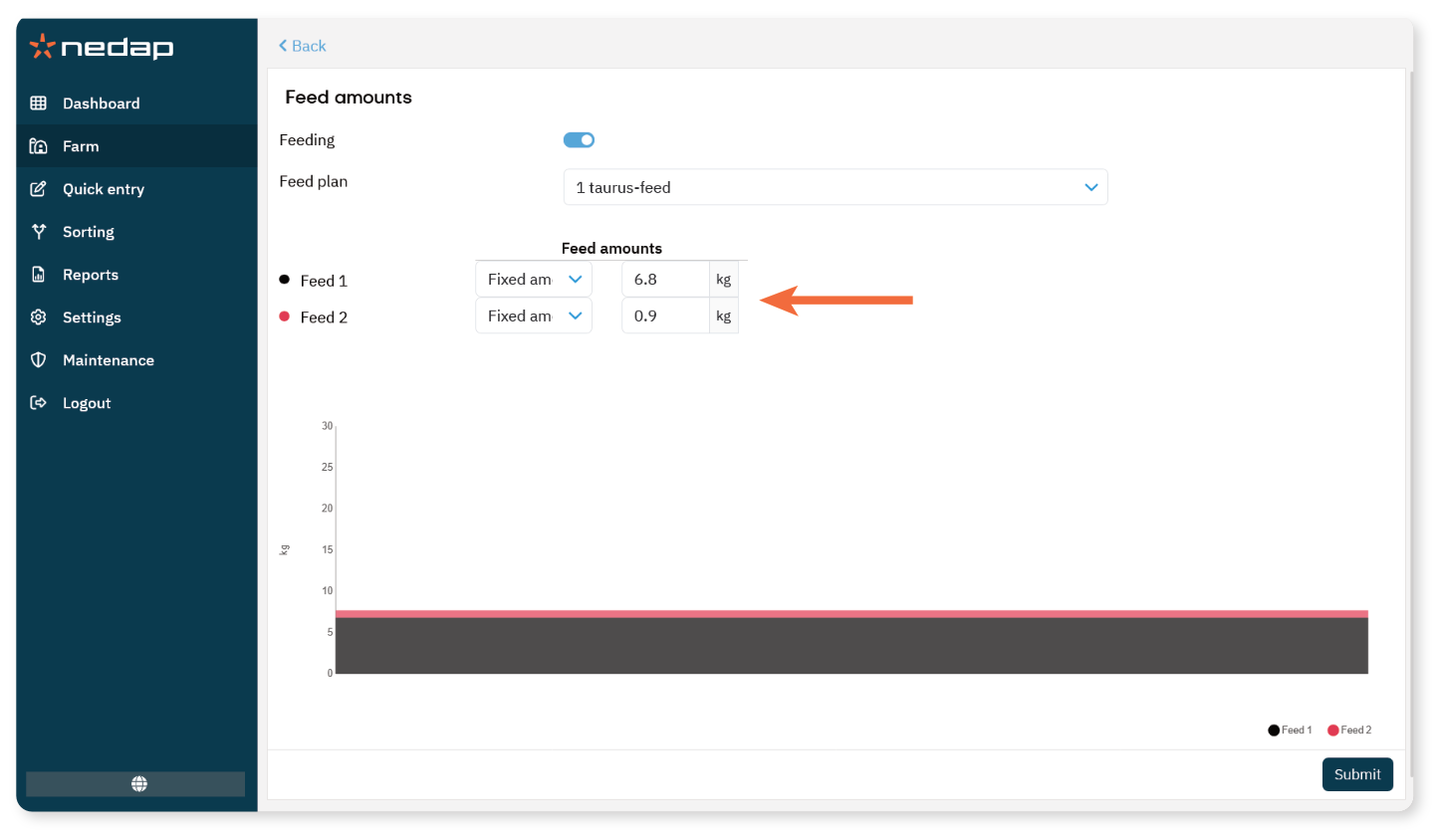 Als je een vaste hoeveelheid gebruikt, voer dan de dagelijkse voerhoeveelheid per voersoort (kg) in.