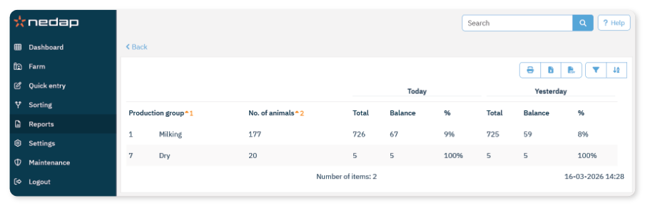 Het rapport 'Voerbalans per productie groep' geeft een overzicht van de totale voerhoeveelheden en voerbalansen per productie groep.