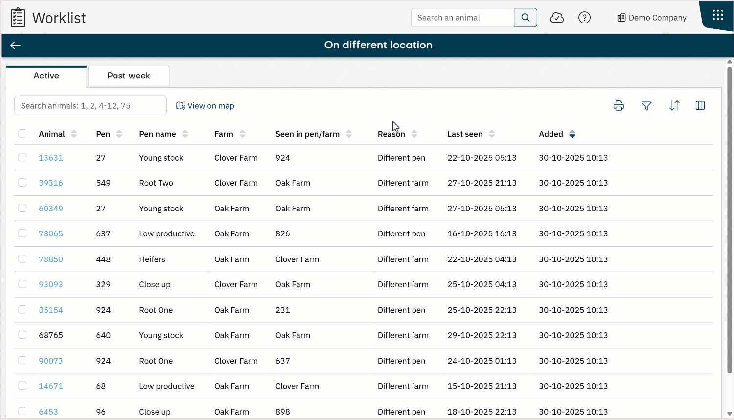 The On different location worklist shows animals that were detected on a farm or in a pen different from their assigned location. To keep your records up to date, follow the steps below to reassign animals.