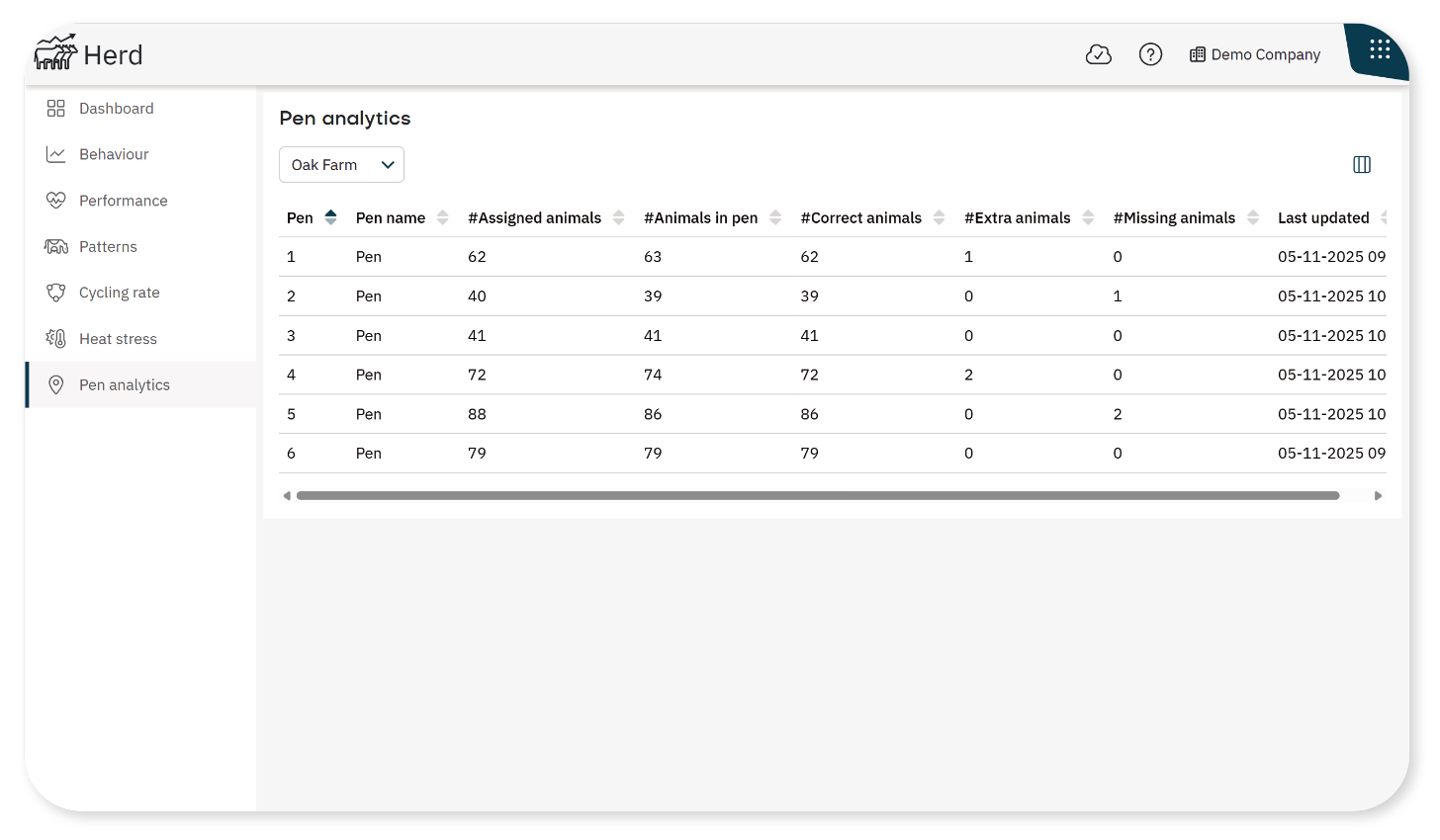 Only monitored pens, which are pens equipped with beacons, appear in this overview. Unmonitored pens are not included.