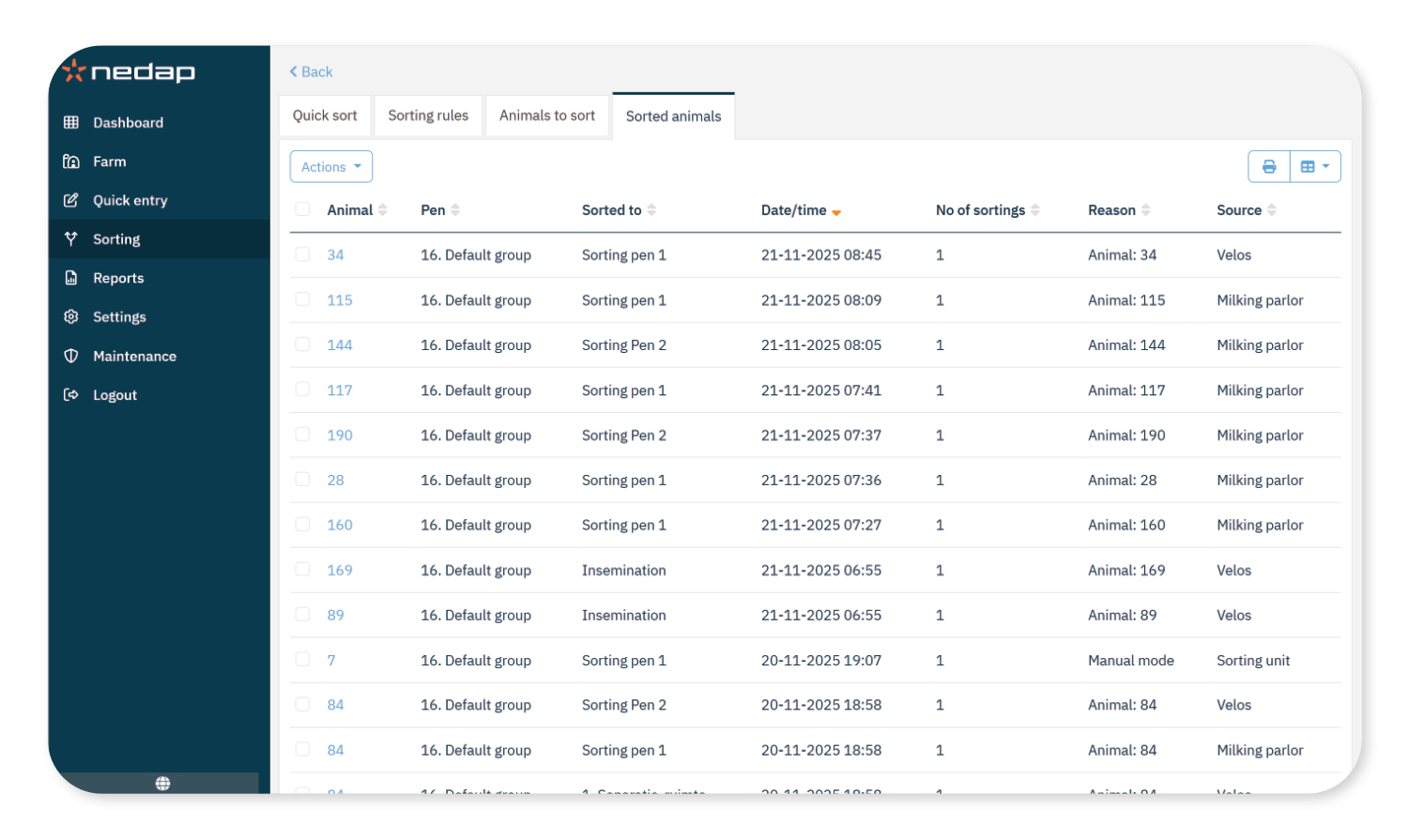 View animals that were sorted the past two days in the Sorted animals tab. You can access the list of sorted animals via the Dashboard and the Sorting page.